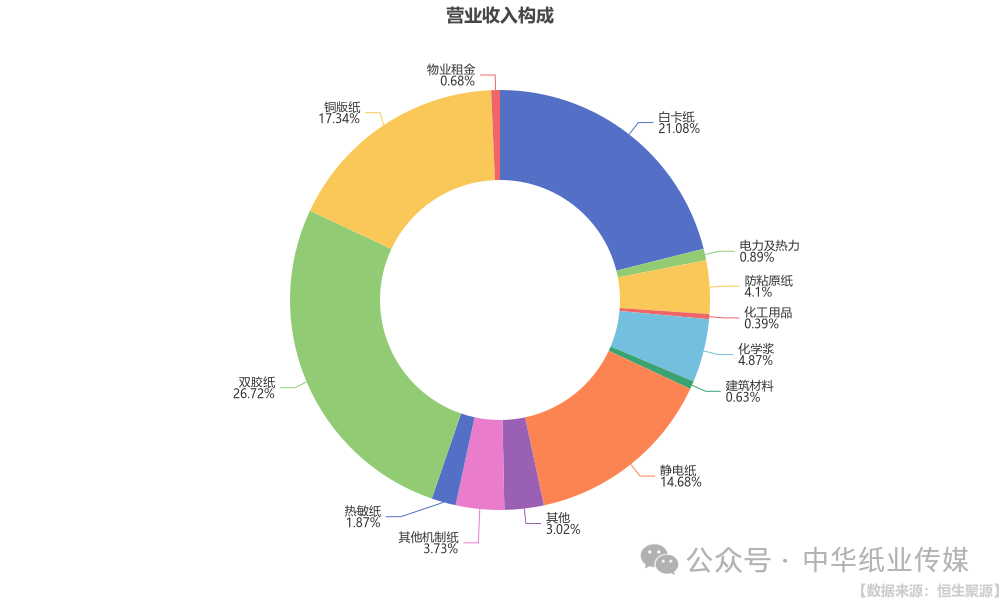 分产品来看,公司双胶纸收入37.10亿元,占比26.72%,同比增长1.14%;白卡纸收入29.26亿元,占比21.07%,同比增长15.18%;铜版纸收入24.08亿元,占比17.33%,同比增长33.11%;静电纸收入20.39亿元,占比14.68%,同比增长6.72%;防粘原纸收入5.70亿元,占比4.10%,同比下降0.43%;热敏纸收入2.60亿元,占比1.86%,同比下降0.99%;其他机制纸收入5.18亿元,占比3.72%,同比下降3.86%;化学浆收入6.76亿元,占比4.87%,同比增长181.24%;电力及热力收入1.24亿元,占比0.89%,同比增长2.80%;物业租金收入0.94亿元,占比0.67%,同比下降14.78%;建筑材料收入0.87亿元,占比0.62%,同比下降17.94%;化工用品收入0.54亿元,占比0.39%,同比下降10.17%;其他收入4.20亿元,占比3.02%,同比下降32.99%