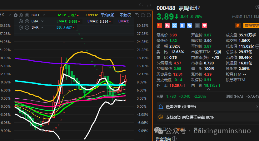 晨鸣纸业的股价走势及市场反应.截至2024年11月11日收盘,晨鸣纸业(000488)报收于3.89元,下跌0.26%,换手率2.09%,成交量35.13万手,成交额1.36亿元。