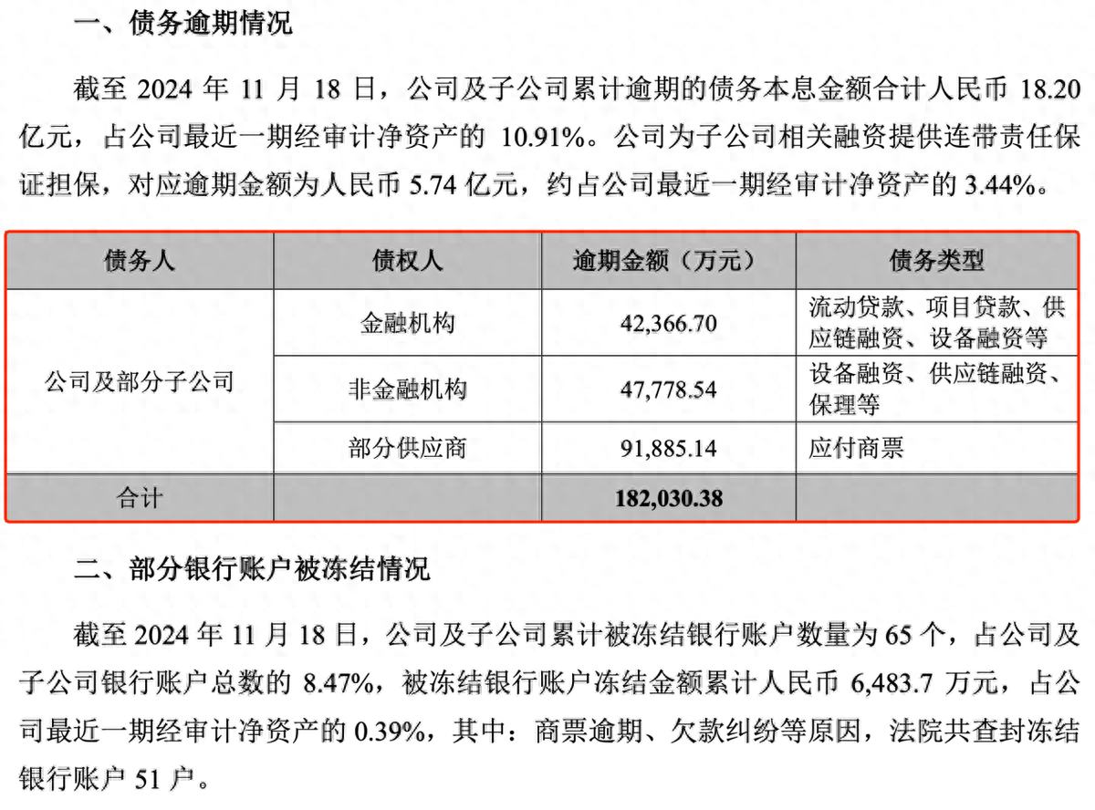11月19日,晨鸣纸业(000488)发布公告称,截至2024年11月18日,公司及子公司累计逾期的债务本息金额合计18.20亿元,占公司最近一期经审计净资产的10.91%。公司为子公司相关融资提供连带责任保证担保,对应逾期金额为5.74亿元,约占公司最近一期经审计净资产的3.44%。