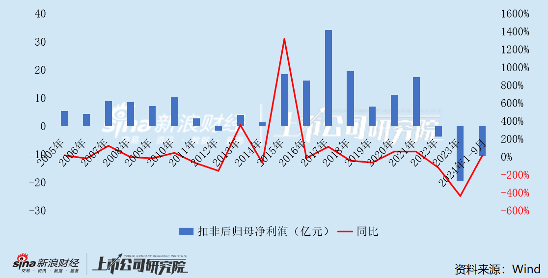 2021年、2022年、2023年、2024年1-9月(以下简称“报告期”),分别实现营业收入330.20亿元、320.04亿元、266.09亿元和198.25亿元,分别同比变动7.43%、-3.08%、-16.86%和0.52%;实现归母净利润20.66亿元、1.89亿元、-12.81亿元和-7.10亿元,分别同比变动20.65%、-90.84%、-776.89%和7.57%;实现扣非后归母净利润17.44亿元、-3.61亿元、-19.42亿元和-10.75亿元,分别同比变动55.83%、-120.73%、-437.30%和14.12%。
