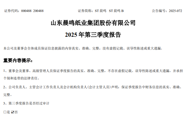 近日,ST晨鸣公布2025年第三季度业绩报告。数据显示,公司前三季度累计实现营业收入33.48亿元,同比大幅下降83.11%;归属于上市公司股东的净利润为亏损60.08亿元,较去年同期由盈转亏。