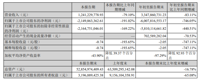 第三季度单季,公司营业收入为12.4亿元,同比下降79.1%;归母净利润从去年同期的亏损7.39亿元扩大至亏损21.5亿元;扣除非经常性损益后的归母净利润也由去年同期的亏损8.04亿元增至亏损21.6亿元,亏损幅度明显扩大。