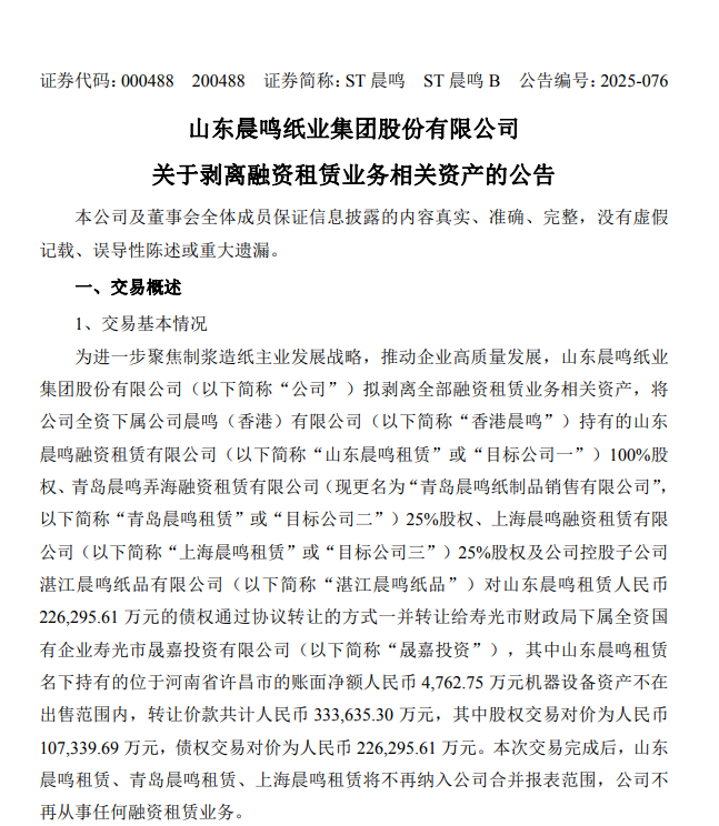 ST晨鸣 12月12日公告,为聚焦制浆造纸核心业务,拟将旗下全部融资租赁业务相关资产,以33.36亿元总对价转让给 寿光市财政局 下属国企—— 寿光市晟嘉投资有限公司 。此举标志着公司正式退出持续亏损的融资租赁领域。