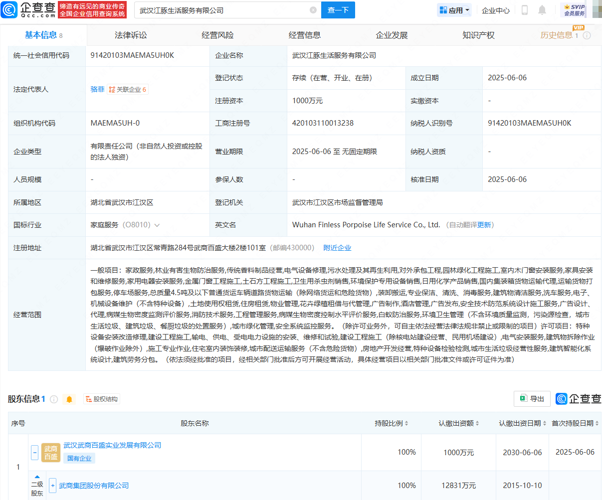 近日,武汉江豚生活服务有限公司成立,法定代表人为骆菲,注册资本为1000万元,经营范围包含:家政服务;林业有害生物防治服务;传统香料制品经营;电气设备修理;园林绿化工程施工;室内木门窗安装服务;家具安装和维修服务等。股权穿透显示,该公司由武商集团间接全资持股。