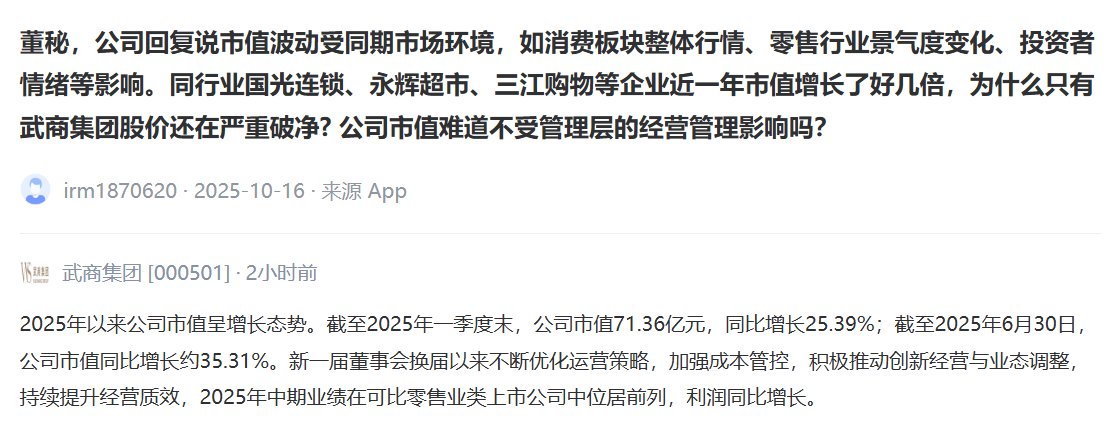 武商集团21日在互动平台上回答投资者提问时表示,2025年以来公司市值呈增长态势。截至2025年一季度末,公司市值71.36亿元,同比增长25.39%;截至2025年6月30日,公司市值同比增长约35.31%。新一届董事会换届以来不断优化运营策略,加强成本管控,积极推动创新经营与业态调整,持续提升经营质效,2025年中期业绩在可比零售业类上市公司中位居前列,利润同比增长。