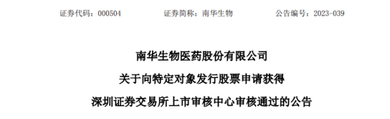 中国经济网北京7月13日讯南华生物(000504.SZ)今日发布关于向特定对象发行股票申请获得深圳证券交易所上市审核中心审核通过的公告。公司于昨日收到深交所上市审核中心出具的《关于南华生物医药股份有限公司申请向特定对象发行股票的审核中心意见告知函》。深交所发行上市审核机构对公司向特定对象发行股票的申请文件进行了审核,认为公司符合发行条件、上市条件和信息披露要求,后续深交所将按规定报中国证监会履行相关注册程序。
