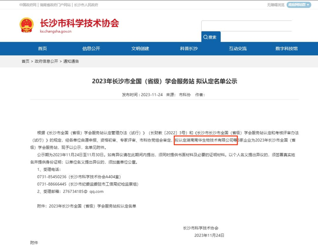 11月24日,长沙市科学技术协会公示了2023年长沙市全国(省级)学会服务站拟认定名单,南华生物医药股份有限公司子公司湖南南华生物技术有限公司中国生物工程学会长沙服务站被认定为2023年长沙市全国(省级)学会服务站。