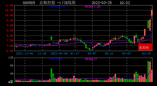 截止收盘,京粮控股报收10.54元/股,涨幅10.02%,成交量58万手,成交额5.94亿元,换手率9.45%。今日2连板。
