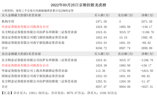 买入前5席为:机构专用、兴业证券股份有限公司陕西分公司、东方财富证券股份有限公司拉萨东环路第二证券营业部、国金证券股份有限公司厦门湖滨南路证券营业部、国海证券股份有限公司南宁新民路证券营业部。共计买入:9246.72万元,共计卖出:6587.74万元。