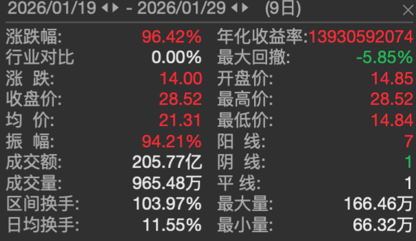 记者注意到,在1月19日~29日期间,招金黄金6板涨停,累计涨幅达96.42%。