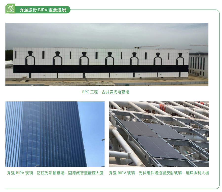 公司旗下秀强股份专注打造绿色产品,持续深耕玻璃深加工产品在光伏新能源领域的应用,凭借在玻璃深加工行业的深厚技术积累,秀强股份成功研发并生产出耐高温、耐酸碱、透光性能优异的BIPV玻璃和组件,并与行业内的领军企业建立了稳固的业务合作关系,与多家知名光伏企业合力打造诸多标杆性工程。2024年,秀强股份完善了BIPV产业链,从EPC、组件、玻璃整条流程贯通,与国内外多家企业进行合作,合作企业涉及晶硅、铜铟镓硒、钙钛矿等多个行业。秀强股份BIPV产品已获UL、TUV、CBC等多家权威机构认证,业务覆盖中国、迪拜、匈牙利、荷兰、捷克等海内外国家和地区。此外,秀强股份BIPV组件与玻璃具有多样的设计和美学,已在国内成功落地数个标志性的建筑项目。