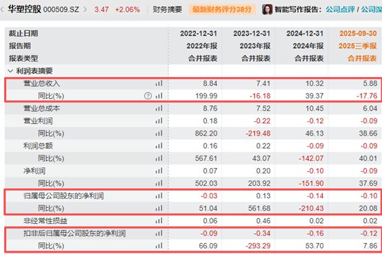 自2022年以来,华塑控股的业绩波动较大:2022年、2023年、2024年和2025年前三季度,其收入同比增速分别为199.99%、-16.18%、39.37%和-17.76%。同期,公司的扣非归母净利润分别为-0.09亿元、-0.34亿元、-0.16亿元和-0.12亿元。