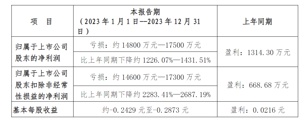 具体来看,2023年,新金路归属于上市公司股东的净利润亏损14,800万元至17,500万元,比上年同期下降1,226.07%至1,431.51%;归属于上市公司股东扣除非经常性损益的净利润亏损14,600万元至17,300万元,比上年同期下降2,283.41%至2,687.19%。