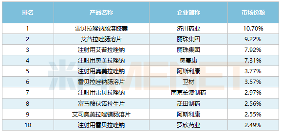 质子泵抑制剂品牌TOP10中,国产品牌占据6个席位,济川药业的雷贝拉唑钠肠溶胶囊首次跻身榜首,市场份额超过10%;丽珠集团的艾普拉唑肠溶片、注射用艾普拉唑钠分别位列第二、第三。