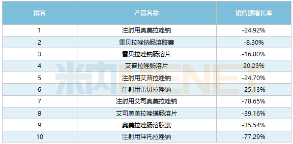 质子泵抑制剂产品TOP10中,注射剂与口服常释剂型各占一半,注射用奥美拉唑钠、雷贝拉唑钠肠溶胶囊、雷贝拉唑钠肠溶片依次位列前三,其中注射用奥美拉唑钠、雷贝拉唑钠肠溶胶囊上半年销售额均超过10亿元。值得一提的是,10个产品中仅丽珠医药的独家品种艾普拉唑肠溶片实现正增长,且涨幅高达20.23%。