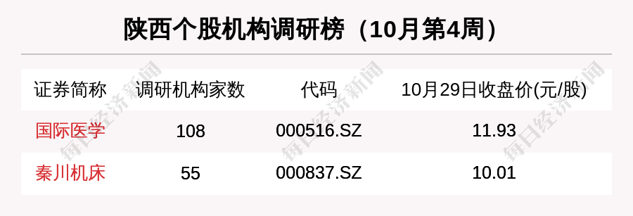 机构调研方面,据统计,10月第4周,有2家陕西上市公司接受机构调研。其中,108家机构到访国际医学,55家机构到访秦川机床。