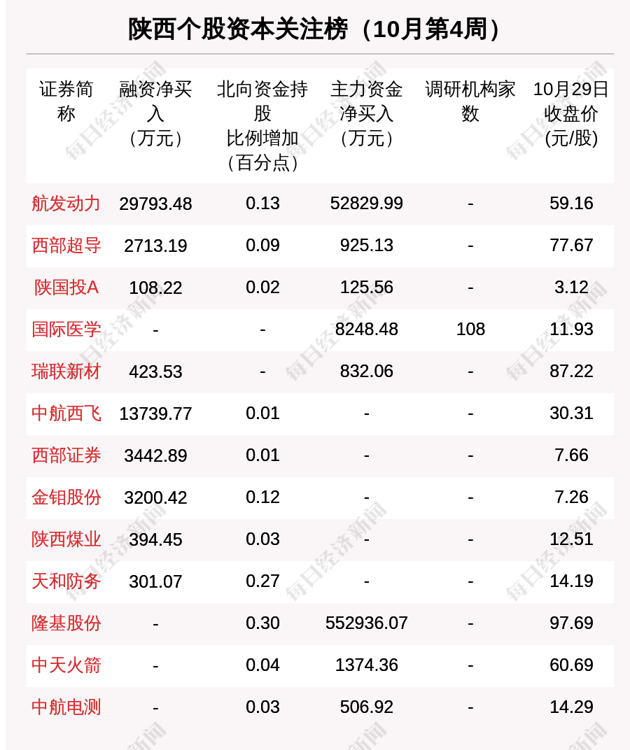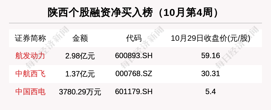 先看融资资金,10月第4周,陕西板块融资净买入总额为3.39亿元。融资净买入最多的陕西股是航发动力,金额是2.98亿元。其次是中航西飞(1.37亿元)和中国西电(3780.29万元)。