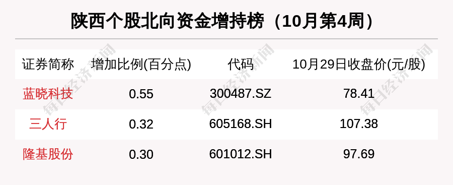 再看北向资金,10月第4周,蓝晓科技北向资金持股比例增加0.55个百分点,三人行北向资金持股比例增加0.32个百分点,隆基股份北向资金持股比例增加0.30个百分点。