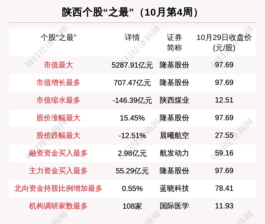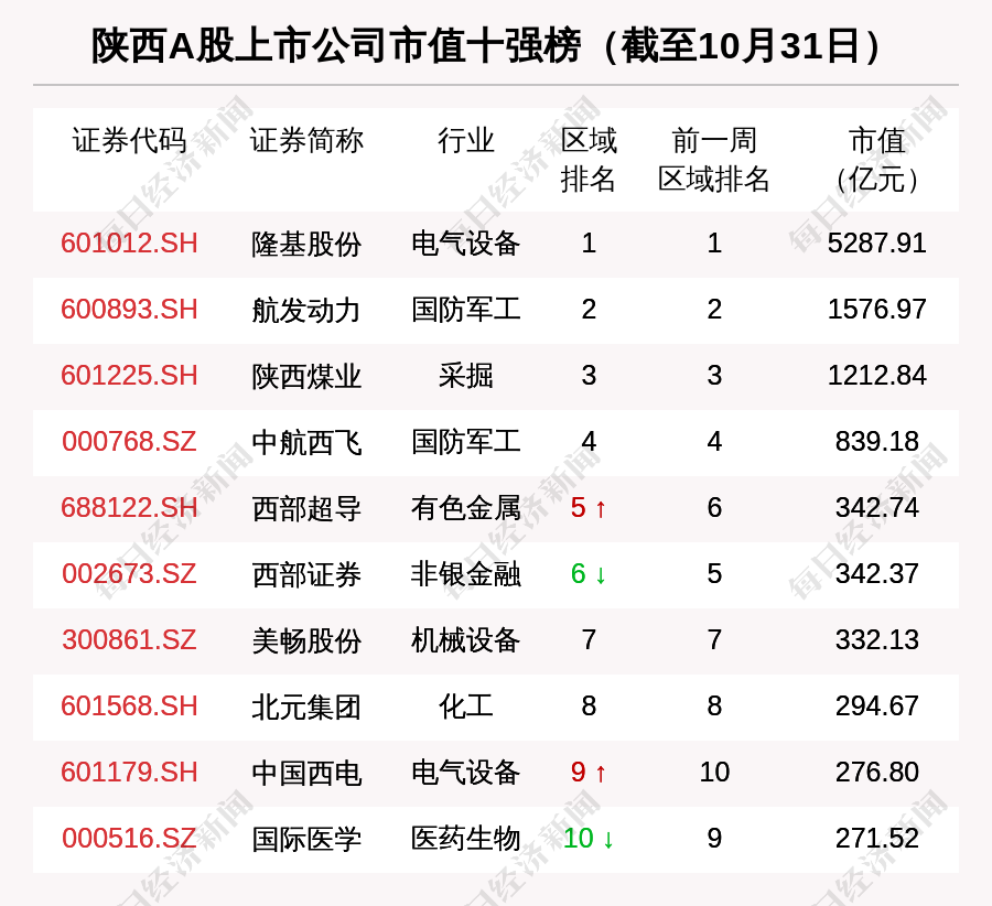 截至10月31日,陕西板块市值最大的是隆基股份,市值最小的是博通股份。上周市值增长最多的是隆基股份,增长707.47亿元;市值缩水最多的是陕西煤业,缩水146.39亿元。