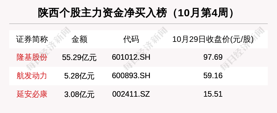 主力资金方面,10月第4周,隆基股份净买入额居首位,为55.29亿元,其次是航发动力(5.28亿元)和延安必康(3.08亿元)。