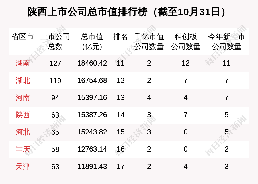 据统计,与河南相比,陕西上市公司总数比河南少31家;千亿市值公司数量比河南少1家;科创板公司数量比河南多3家;今年新上市公司数量比河南少2家。