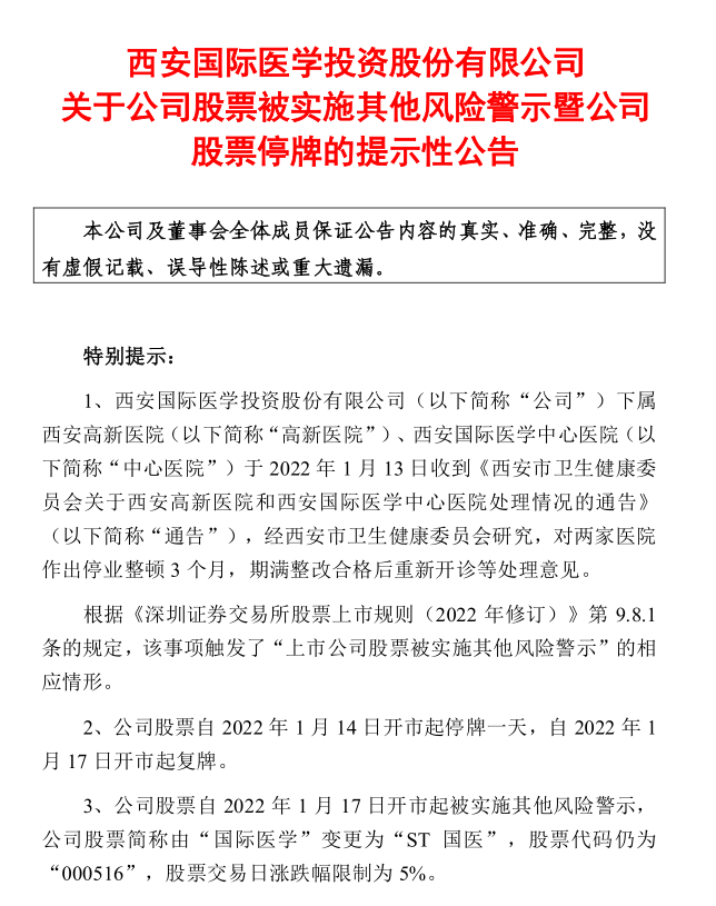 同日晚间,公司还发布公告,下属高新医院、中心医院于2022年1月13日收到通告,经西安市卫生健康委员会研究,对两家医院作出停业整顿3个月,期满整改合格后重新开诊等处理意见。根据《深圳证券交易所股票上市规则(2022 年修订)》第 9.8.1条的规定,该事项触发了“上市公司股票被实施其他风险警示”的相应情形。公司股票自2022年1月14日开市起停牌一天,自2022年1月17日开市起复牌。公司股票自2022年1月17日开市起被实施其他风险警示,公司股票简称由“国际医学”变更为“ST 国医”,股票代码仍为“000516”,股票交易日涨跌幅限制为 5%。