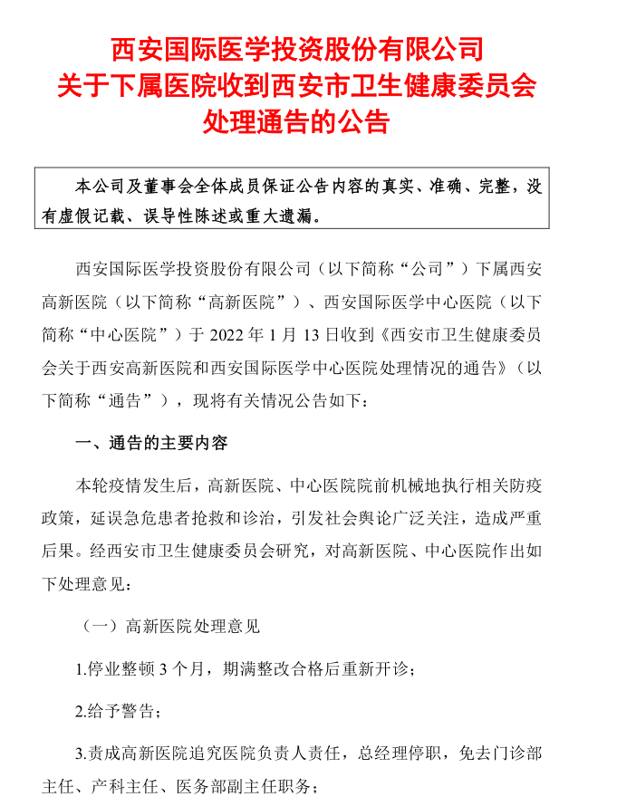 1月13日,西安国际医学投资股份有限公司披露收到关于下属医院收到西安市卫生健康委员会处理通告的公告。据公告,西安国际医学投资股份有限公司(简称“国际医学”“公司”)下属西安高新医院(简称“高新医院”)、西安国际医学中心医院(简称“中心医院”)于2022年1月13日收到《西安市卫生健康委员会关于西安高新医院和西安国际医学中心医院处理情况的通告》(简称“通告”)。