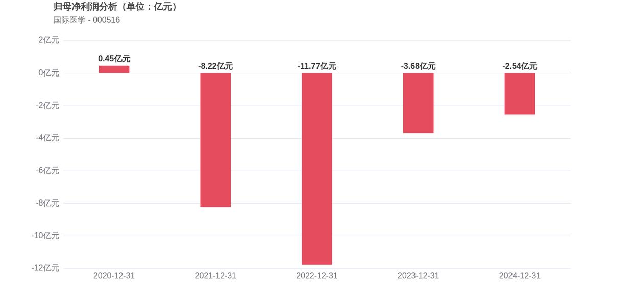 利润角度分析,2020年国际医学实现归母净利润0.45亿元,2024年-2.54亿元。公司盈利能力出现明显波动,由盈利转为亏损。