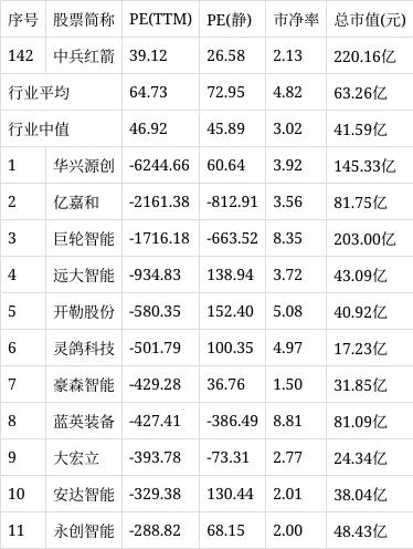 从行业市盈率排名来看,公司所处的专用设备行业市盈率平均64.73倍,行业中值46.92倍,中兵红箭排名第142位。