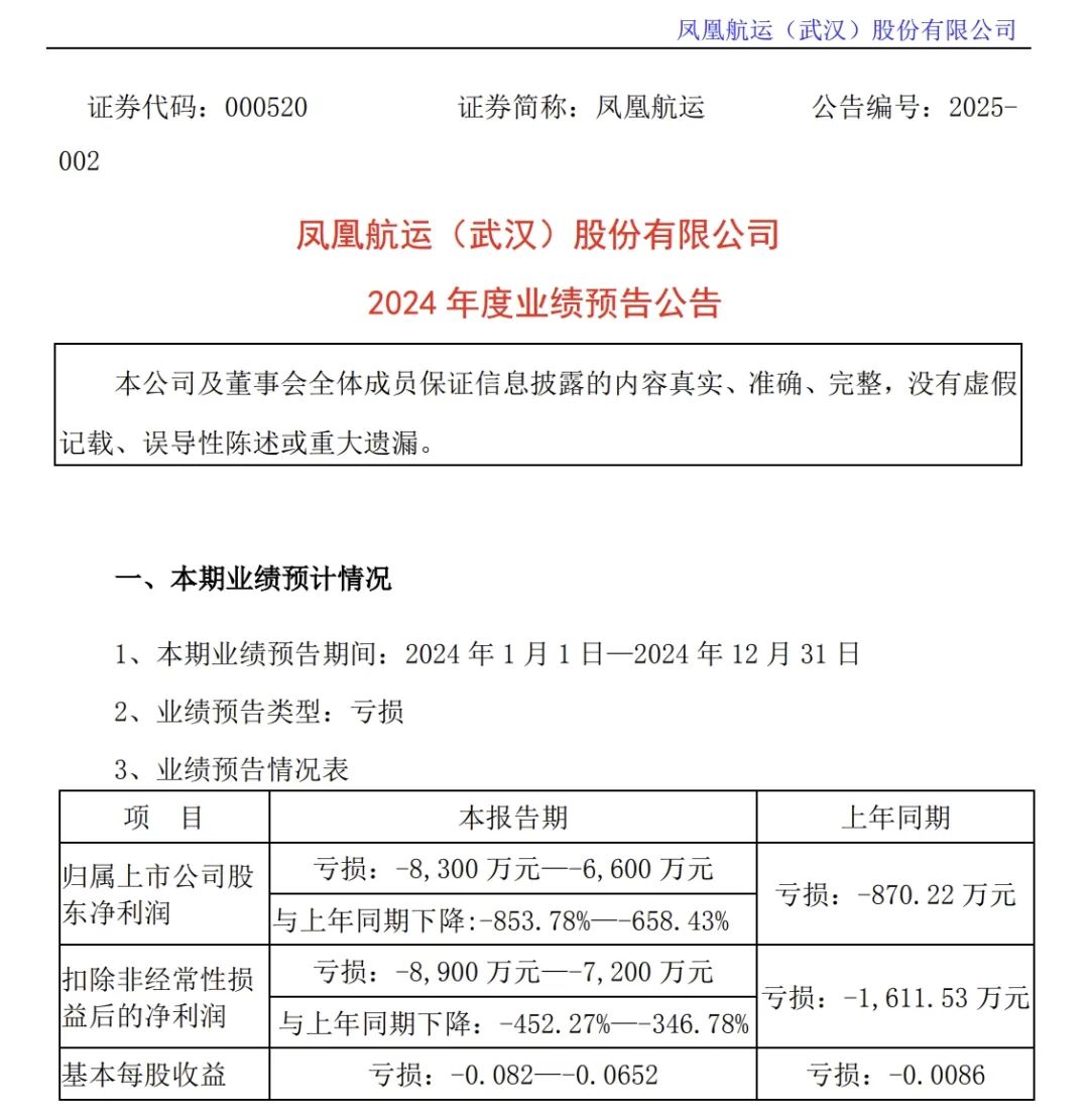 1月22日,凤凰航运(武汉)股份有限公司(证券代码:000520,简称:凤凰航运)发布了2024年度业绩预告公告。