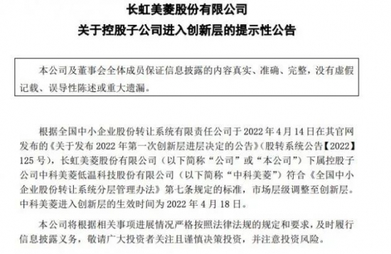 4月17日消息,日前,长虹美菱发布公告称,公司下属控股子公司中科美菱符合《全国中小企业股份转让系统分层管理办法》第七条规定的标准,市场层级调整至创新层。