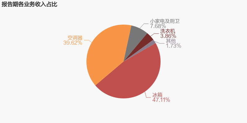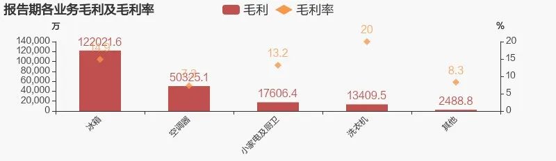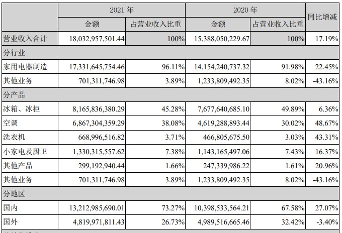 从业务结构来看,“冰箱”是企业营业收入的主要来源。具体而言,“冰箱”营业收入为81.7亿,营收占比为47.1%,毛利率为14.9%。空调业务居于其后,营业收入为68.7亿,营收占比为38.8%。国内外业绩双增长,国内业务同比增长超过27.07%,国外业务增长相比上年略有减少,为-3.4%。