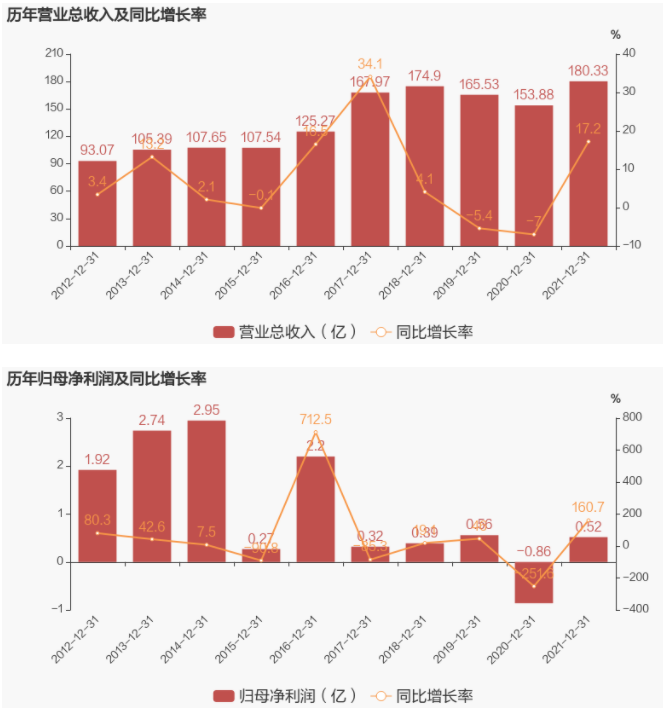 长虹美菱2021年报显示,公司主营收入180.33亿元,同比上升17.19%;归母净利润5189.84万元,同比上升160.65%;扣非净利润-14021.76万元,同比上升49.53%。公司收入主要来源于冰箱(柜)、空调、洗衣机、小家电和厨卫、生物医疗等,合计收入为 173.32 亿元,占公司营业收入的比例为 96.11%。