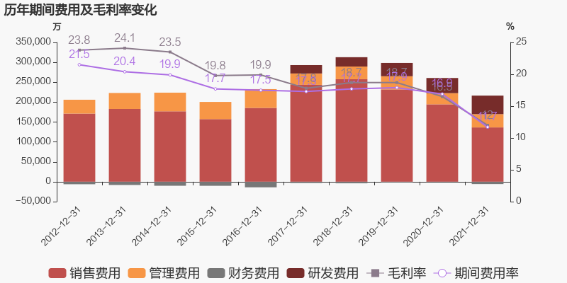 公司2021年营业成本158.7亿,同比增长23.5%,高于营业收入17.2%的增速,导致毛利率下降4.5%。期间费用率为11.7%,较去年下降5.2%。经营性现金流大幅下降88.5%至1.6亿。