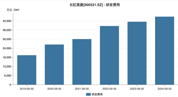 从单项费用来看,长虹美菱近年来明显加大了在研发费用上的支出,其研发费用呈逐年增长趋势。今年前三季度,公司的研发费用同比增长8.11%至4.48亿元。