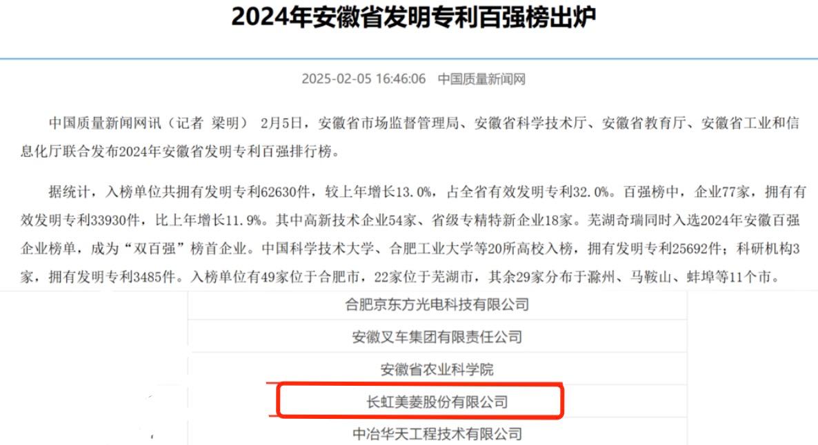 近日,2024年安徽省发明专利百强排行榜发布。长虹美菱再次入选,继2023年之后再次蝉联榜单,成功斩获发明专利百强企业。