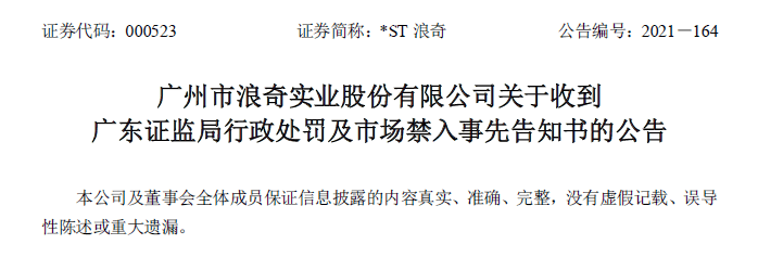 2021年11月11日晚,广州市浪奇实业股份有限公司(以下简称:广州浪奇,证券代码:000523证券简称:*ST浪奇)发布《关于收到广东证监局行政处罚及市场禁入事先告知书的公告》、《关于法院裁定批准重整计划的公告》。