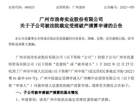 12月29日,广州市浪奇实业股份有限公司发布了旗下控股的广州市岜蜚特贸易有限公司被法院裁定受理破产清算申请的公告。
