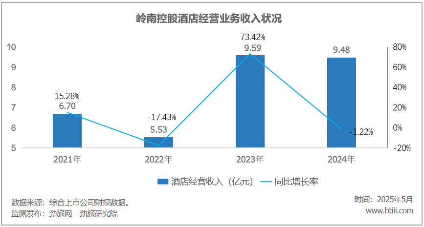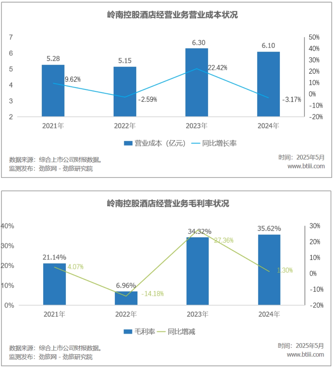 酒店经营业务营业收入为9.48亿元,上年同期为9.59亿元,同比下降1.22%。营业成本为6.1亿元,上年同期为6.3亿元,同比下降3.17%。毛利率为35.62%,上年同期为34.32%,同比增长1.3个百分点。