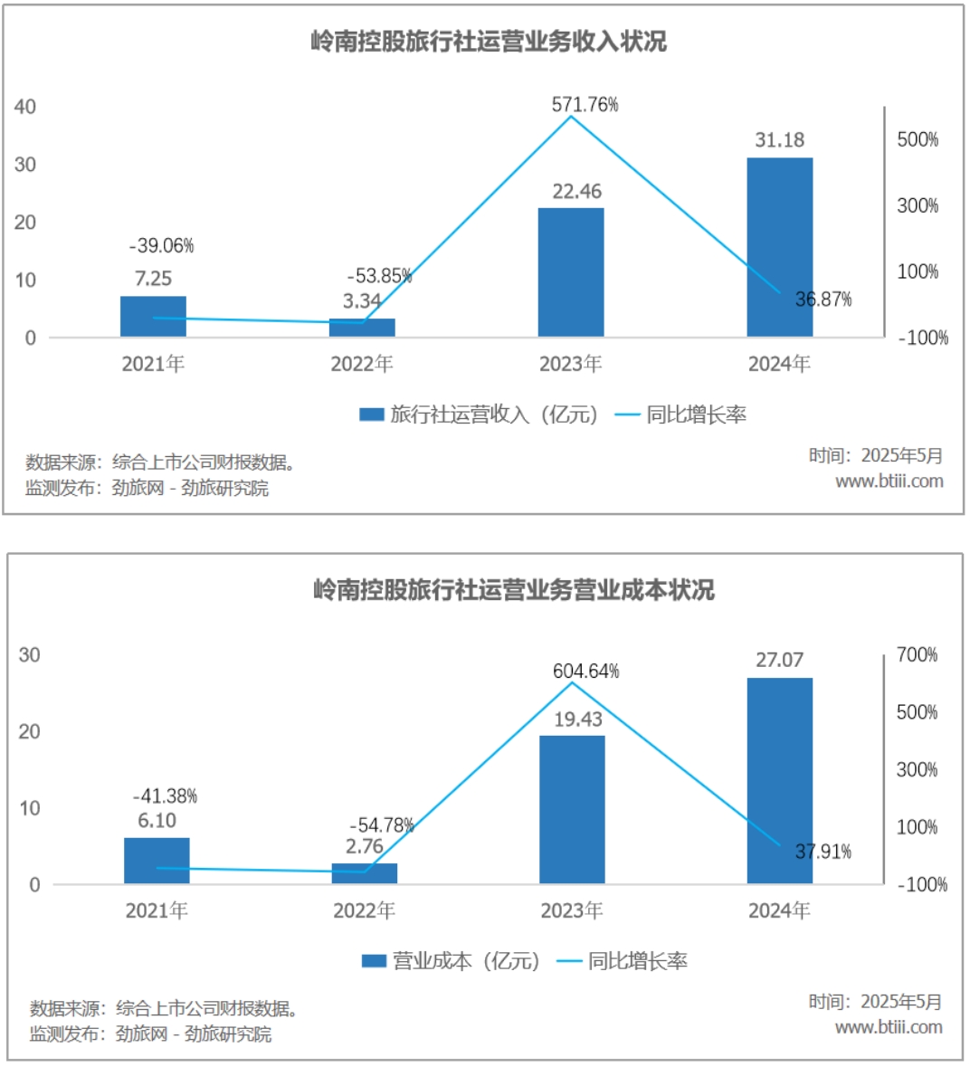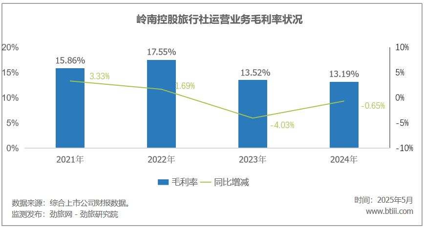 旅行社运营业务方面,营业收入为31.18亿元,上年同期为22.46亿元,同比增长36.8%。营业成本为27.07亿元,上年同期为19.43亿元,同比增长37.91%。毛利率13.19%,上年同期为13.52%,同比上年减少0.65个百分点。