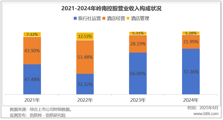 在营业收入中,旅行社运营、酒店经营、酒店管理业务占比分别为72.36%、21.99%、5.28%。
