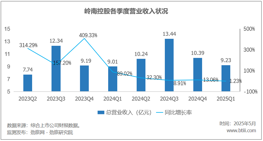 根据报告,2025年一季度岭南控股实现营业收入9.23亿元,上年同期为9.01亿元,同比增长1.23%。