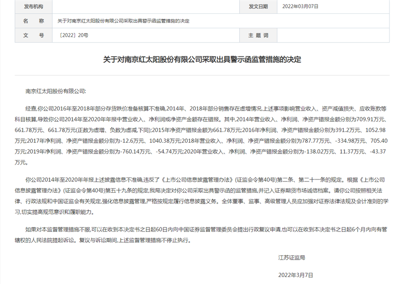 记者3月15日从江苏证监局官网获悉,南京红太阳股份有限公司(股票代码:000525.SZ 以下简称:红太阳)因为3个年度存货跌价准备核算不足和2个年度虚增部分销售,导致2014年到2020年长达七年的信息披露中营业收入、净利润或净资产金额存在错报,合计错报总金额高达8028.2万元。近日红太阳被江苏证监局采取监管措施出具警示函,并记入证券期货市场诚信档案。