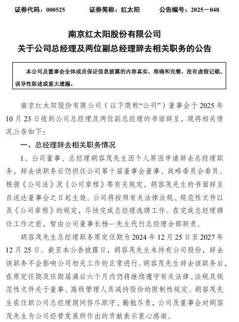 在此前的10月24日,红太阳发布公告称,公司董事、总经理胡容茂,董事、副总经理杨斌,以及副总经理王国平同时递交辞呈,申请辞去各自管理职务,但继续留任董事会或公司其他岗位。尽管公司声称高管离职不会影响正常运营,且由董事长杨一暂代总经理职责,但行业人士指出,此次集体辞职或与公司持续的业绩压力直接相关。这是公司继上半年巨亏2.08亿元之后,再度引发市场高度关注。