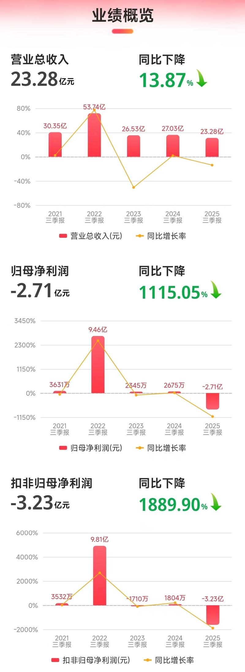 10月28日晚间,A股上市公司红太阳(000525.SZ)披露2025年三季报。报告显示,公司前三季度实现营业总收入23.28亿元,同比下降13.87%;归属于上市公司股东的净利润为-2.72亿元,与上年同期盈利2674.75万元相比,由盈转亏,同比大幅下降1115.05%;扣除非经常性损益的净利润为-3.23亿元,同比下降1889.90%。公司的综合毛利率为7.41%,较上年同期下降18.06个百分点;加权平均净资产收益率为-9.64%。值得注意的是,公司在2025年第一季度实现盈利后,于第二季度出现大幅亏损,导致上半年整体亏损2.08亿元。第三季度单季,公司归母净利润再次亏损6306万元。