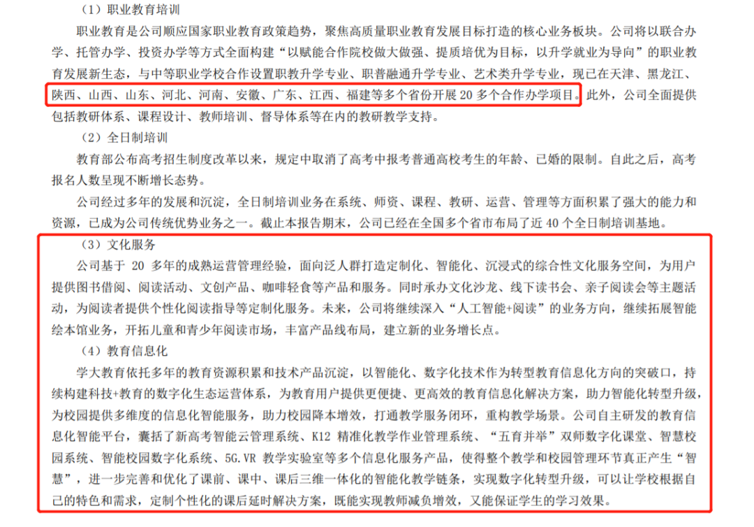 在半年报中,对于职业教育的进展,学大教育简要提到,现已在天津、黑龙江、陕西、山西、山东、河北、河南、安徽、广东、江西、福建等多个省份开展20多个合作办学项目,但对于具体的收入并未披露。文化服务、教育信息化等业务,更是没有提及具体的落地项目。