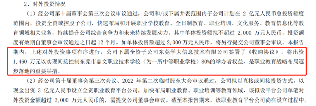 此外,三季报还提到,学大教育将出资1460万元以实现间接控制东莞市鼎文职业技术学校(为一所中等职业学校)80%的举办者权益。