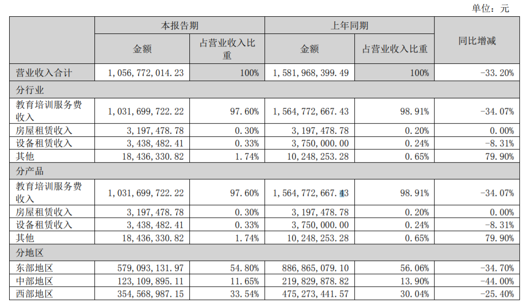 在营收构成上,职业教育业务并没有单独列出,学大教育的营收构成主要还是教育培训服务费收入。这项业务在今年上半年依然占比97.60%,是绝对的核心业务。