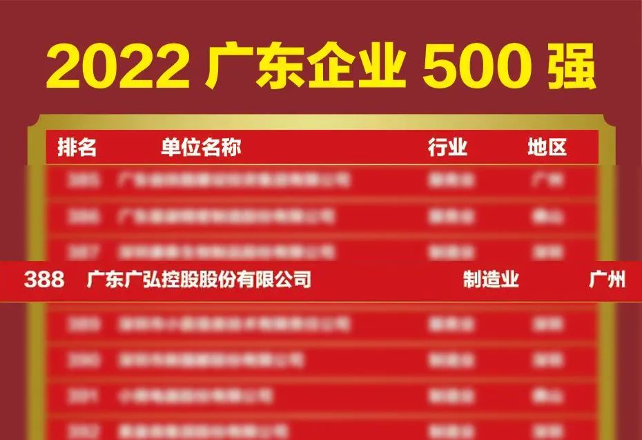 10月12日上午,广东省企业联合会、广东省企业家协会在广州举办2022广东企业500强研究新闻发布会,向社会发布《2022广东500强企业发展报告》及“2022广东企业500强”榜单。广东广弘控股股份有限公司再度上榜,入选“2022广东企业500强”。