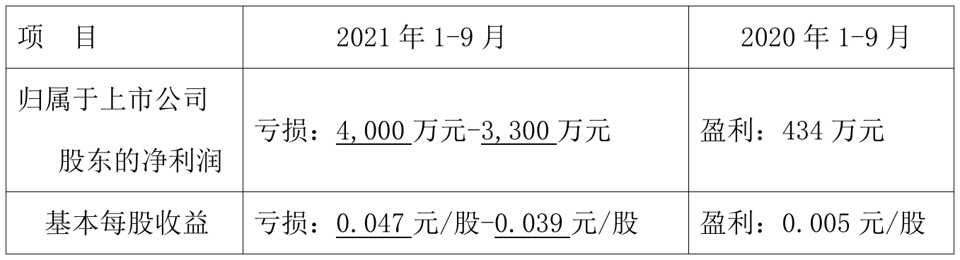 10月14日,冰山冷热(000530)近日发布2021年前三季度业绩预告公告,预计2021年前三季度实现归属于上市公司股东的净利润为亏损4000万元–3300万元,同比由盈转亏。